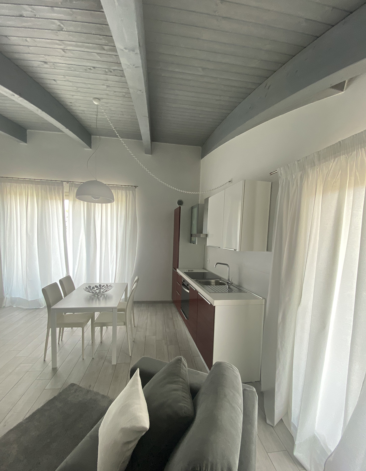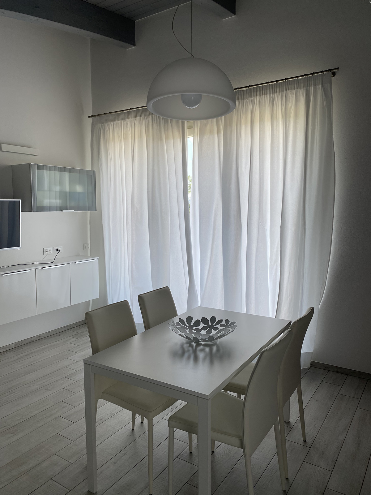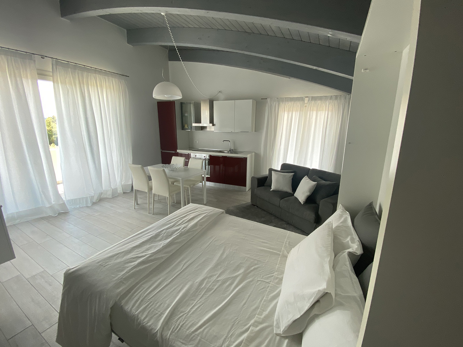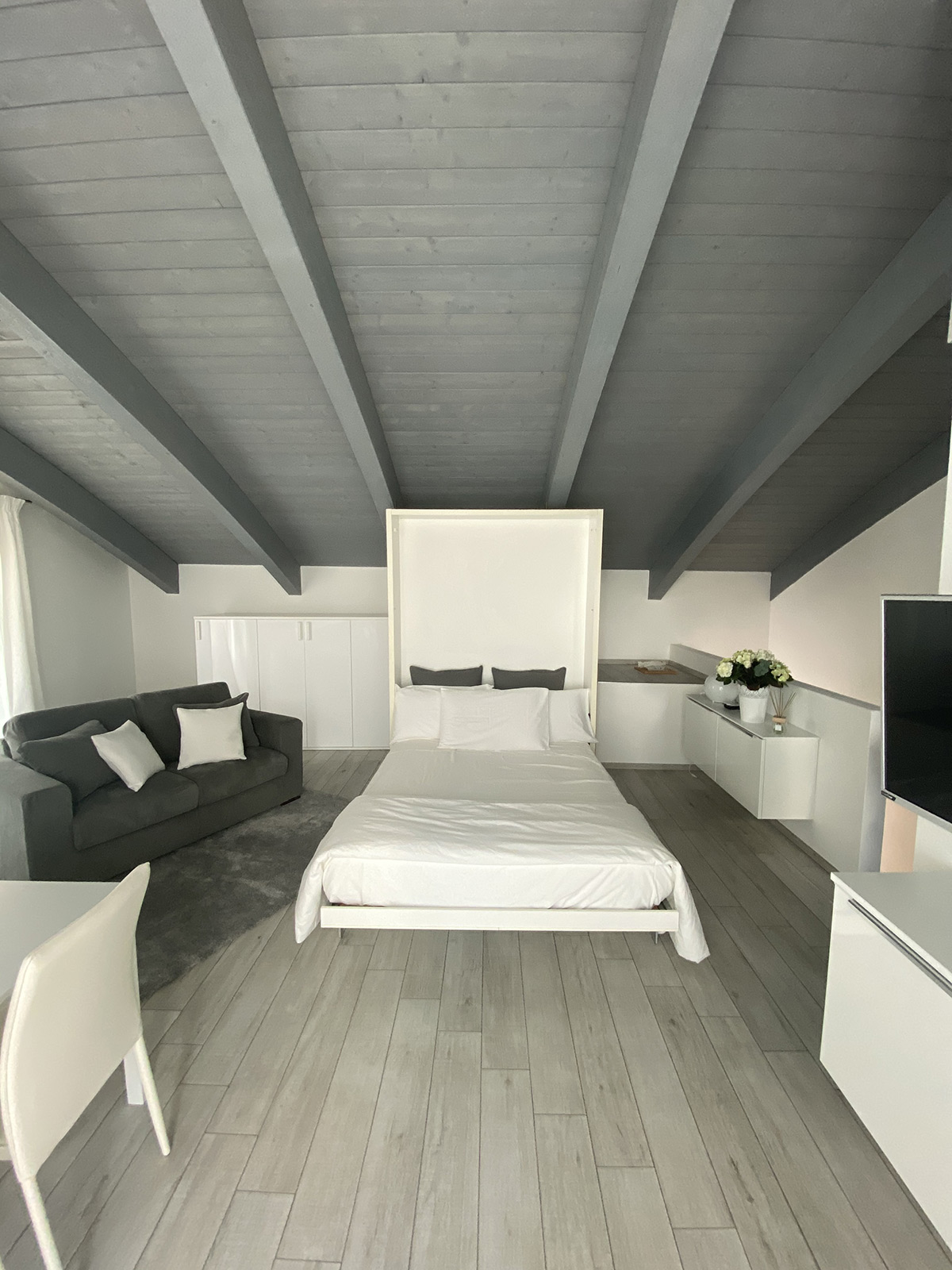 The entrance of the studio apartment opens onto a bright living area finely furnished in shades of white and dark grey. The carefully arranged furniture elements and thenatural lightfrom the large French window ensure an immediate feeling of comfort. The elegant white TV cabinet favours a perfect view from the table as well as from the sofa.