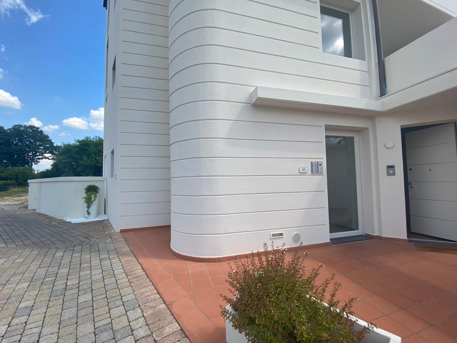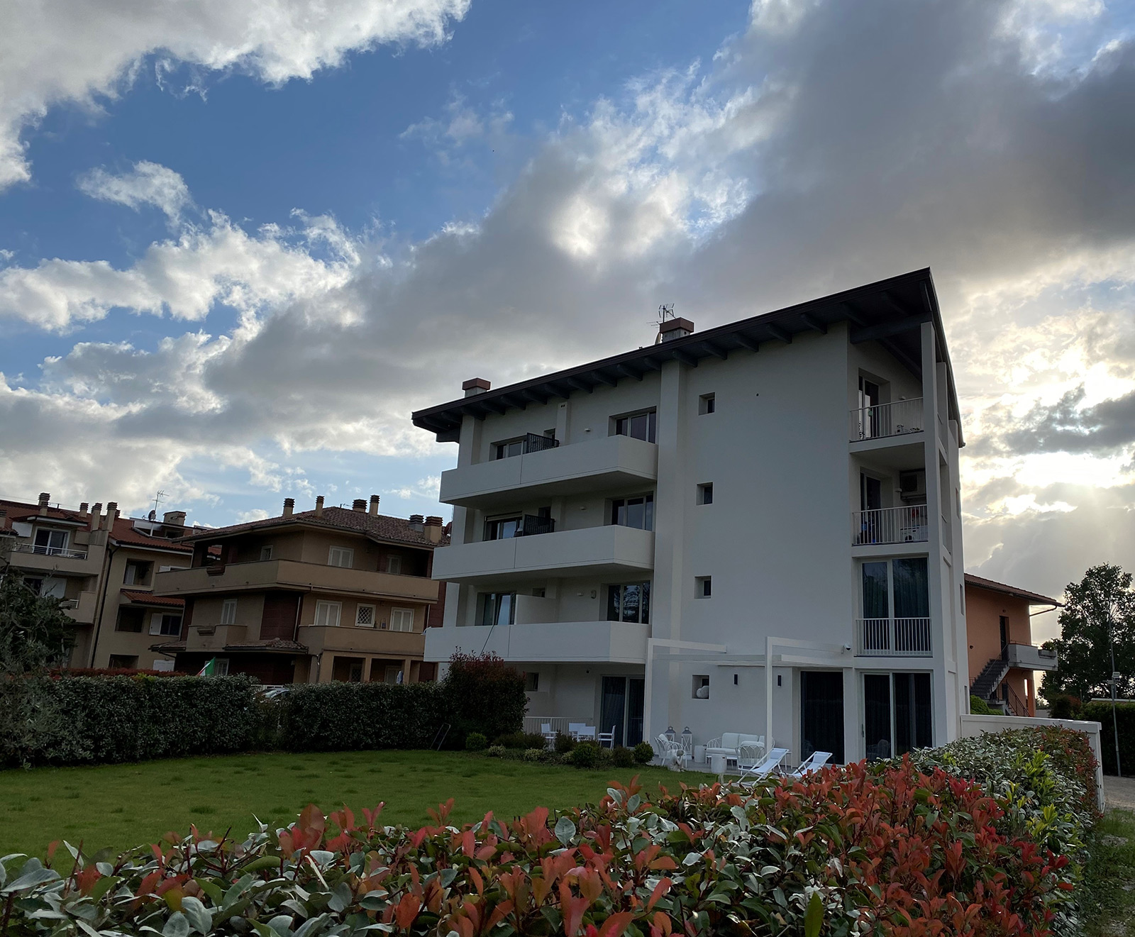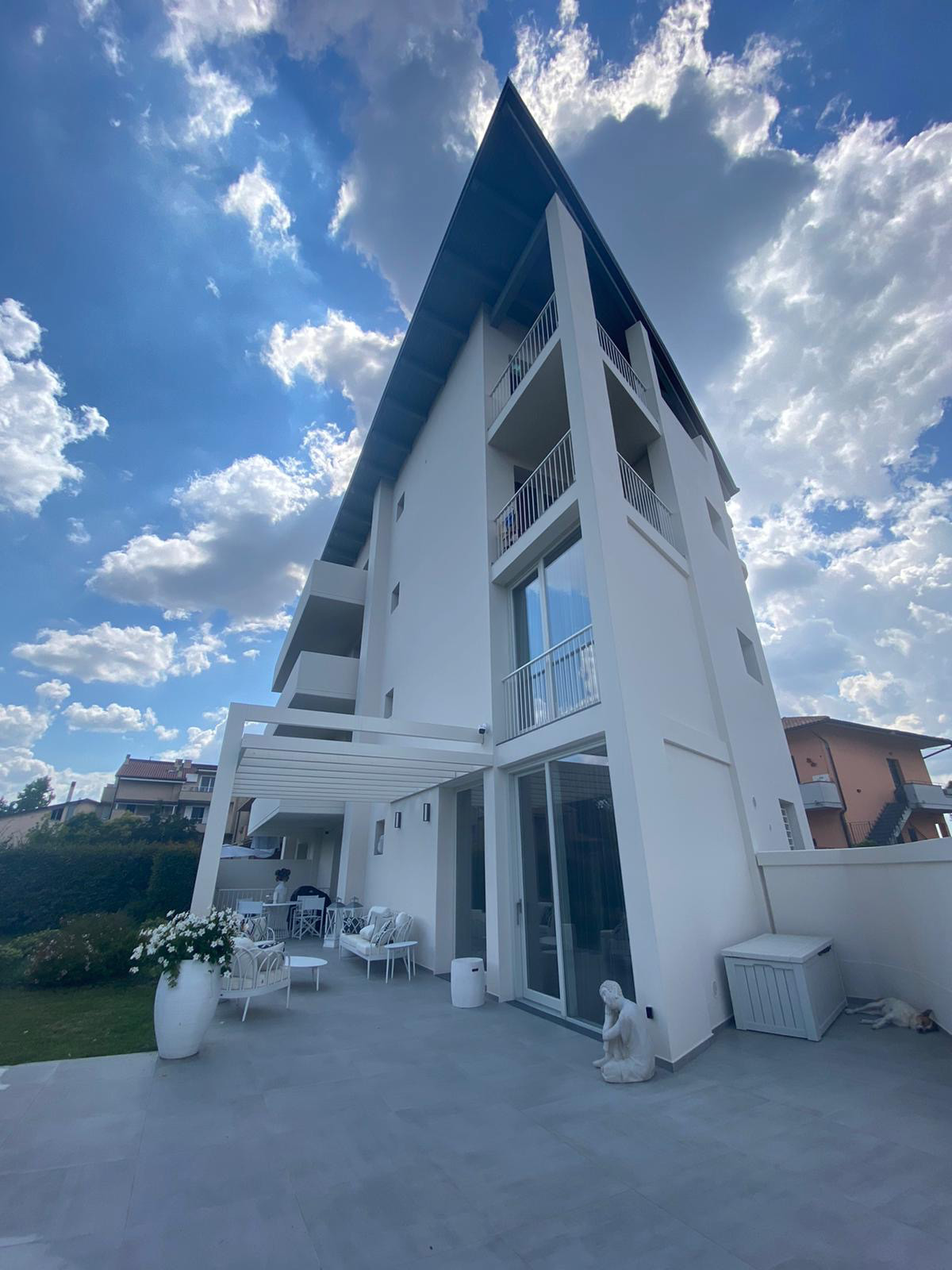 The flat is located in a magnificent new building, consisting of studios and two flats on three levels. Surrounded by the greenery of a large garden, the building is entirely managed by our Real Estate Company. Elegance and functionality combine with the tranquillity of the setting and the refinement of the finishes.