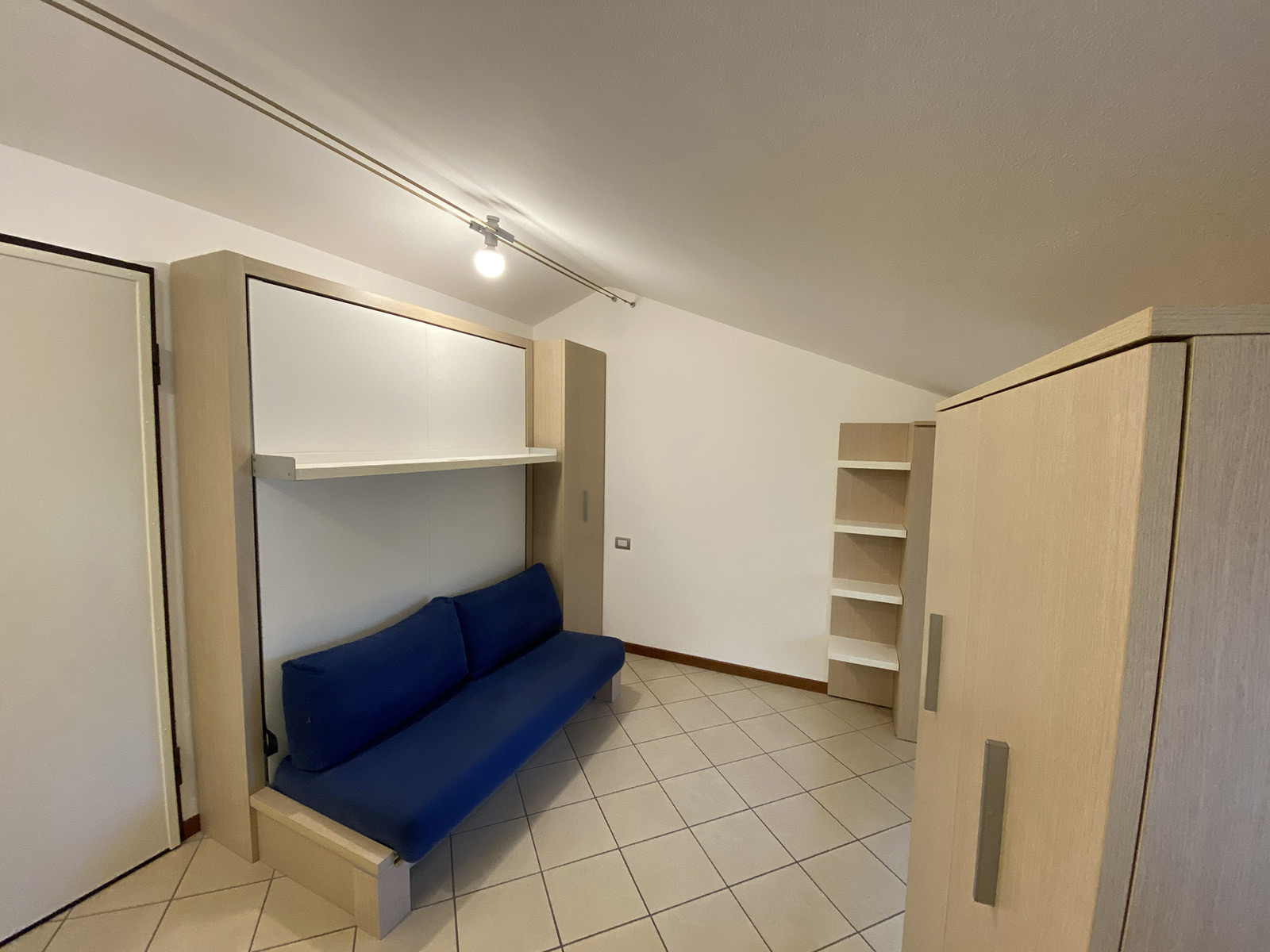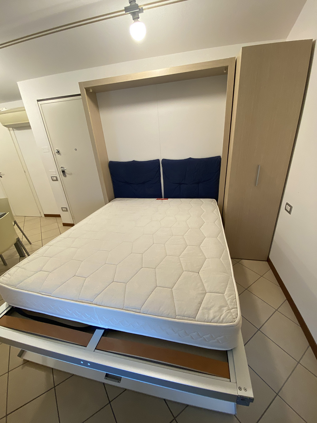 The foldaway bed, in correspondence with the sofa, makes it possible to transform the living area into a comfortable sleeping area, equipped with everything necessary. Completing the flat is a windowed bathroom with an elegant and essential design, with fine finishes.