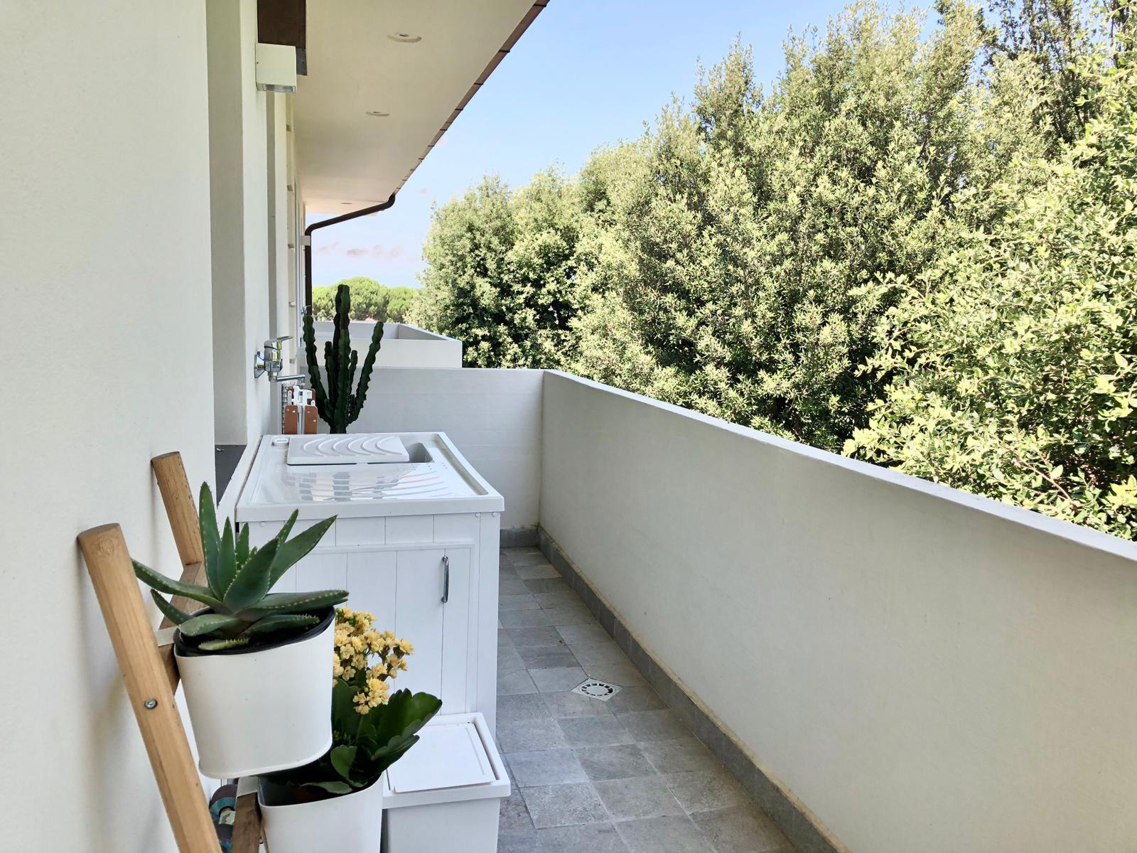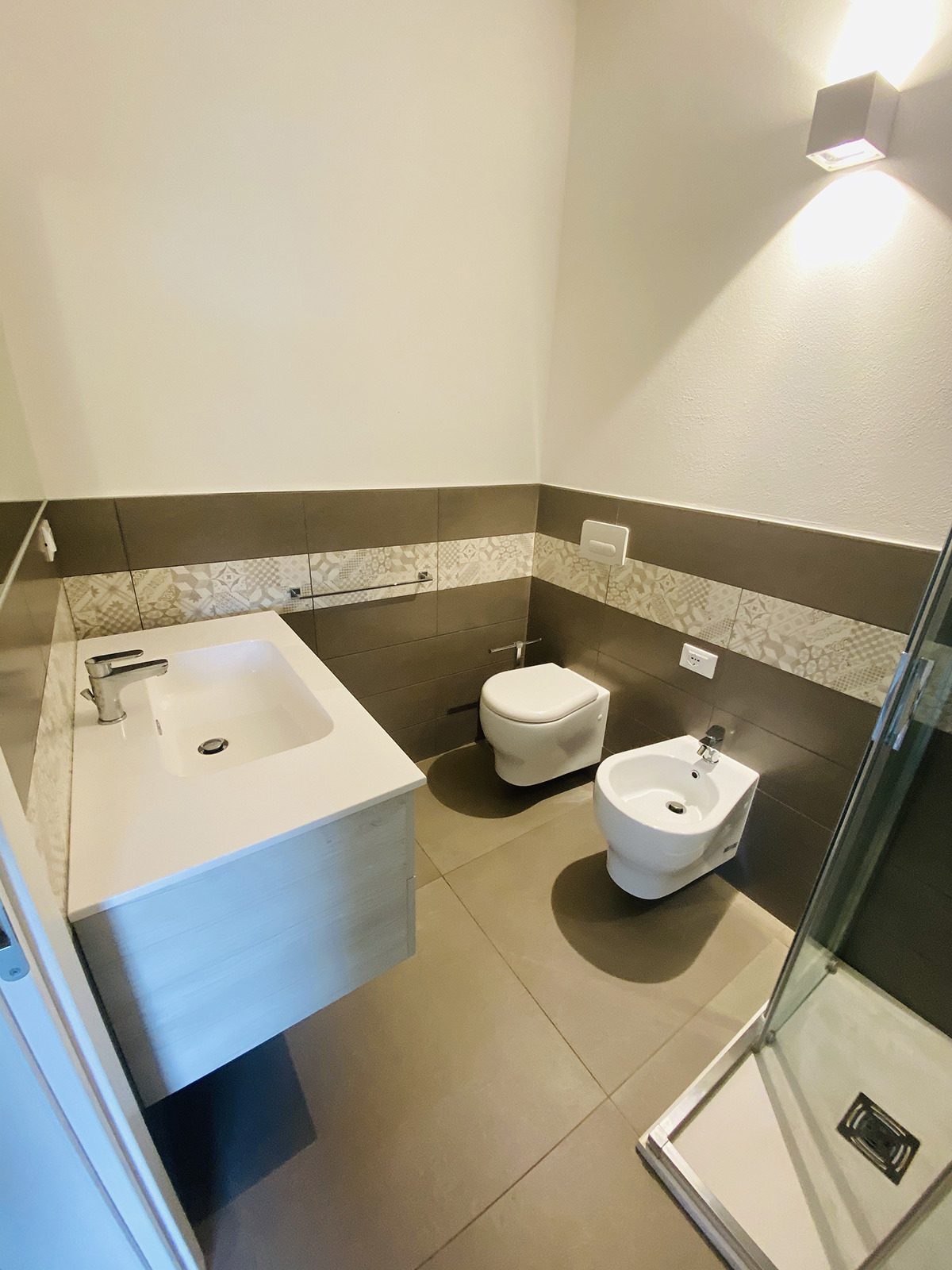 The attention given to the living and sleeping areas also extends to the bathrooms, elegantly furnished with exclusive finishes. Each three-room apartment on the upper levels of the building also has a terrace overlooking the green surroundings.