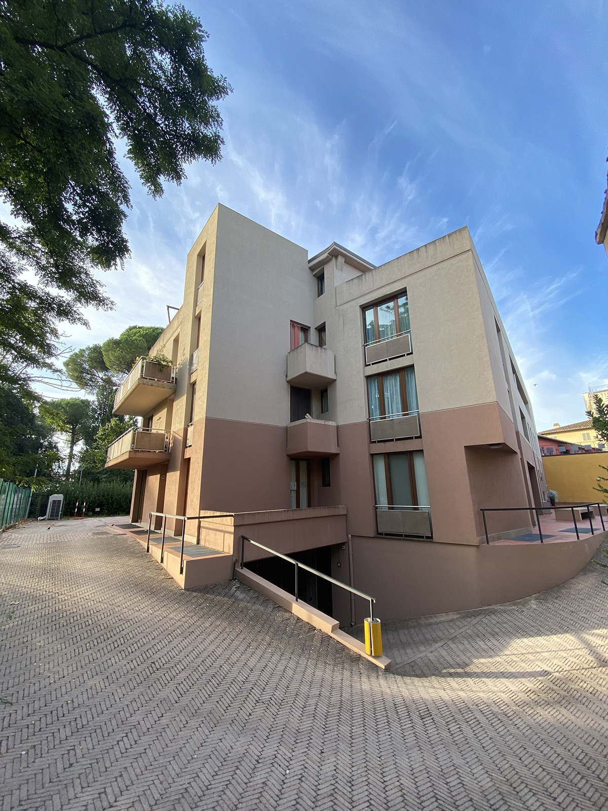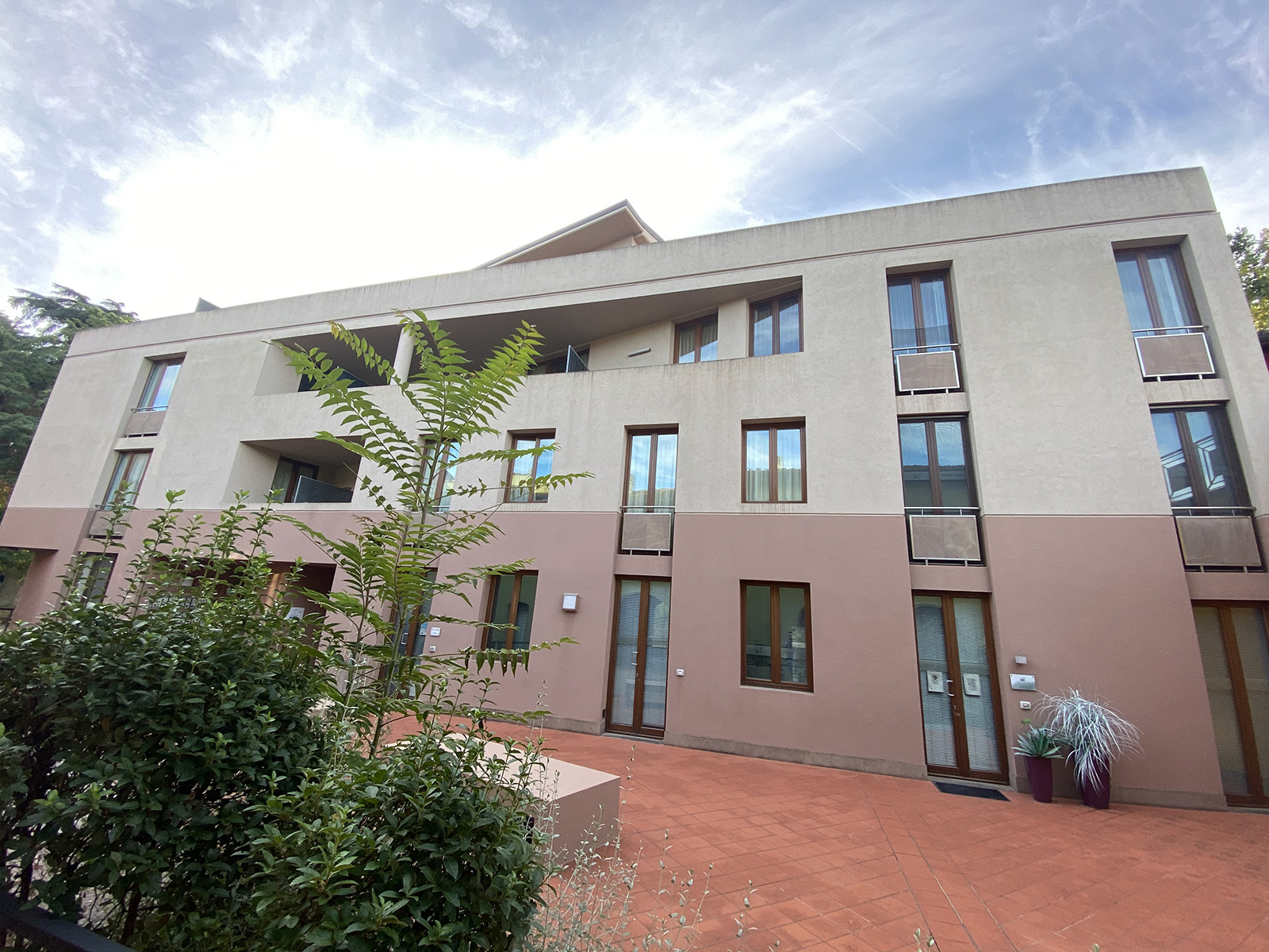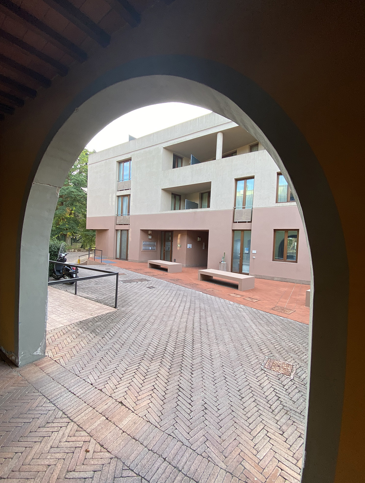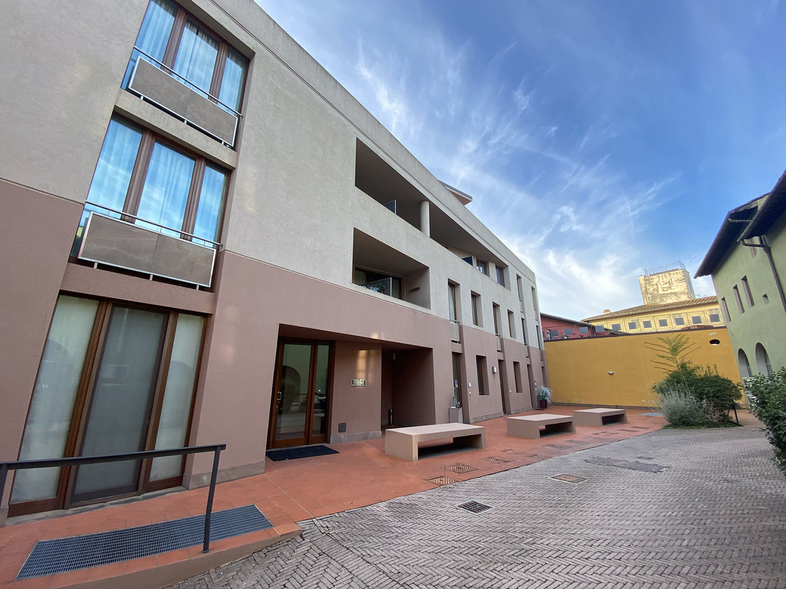 The two-room apartment in Empoli centre is part of a three-storey building of innovative design with paved courtyard and benches in front. The building is accessible by residents only through an elegant gate along the main street.