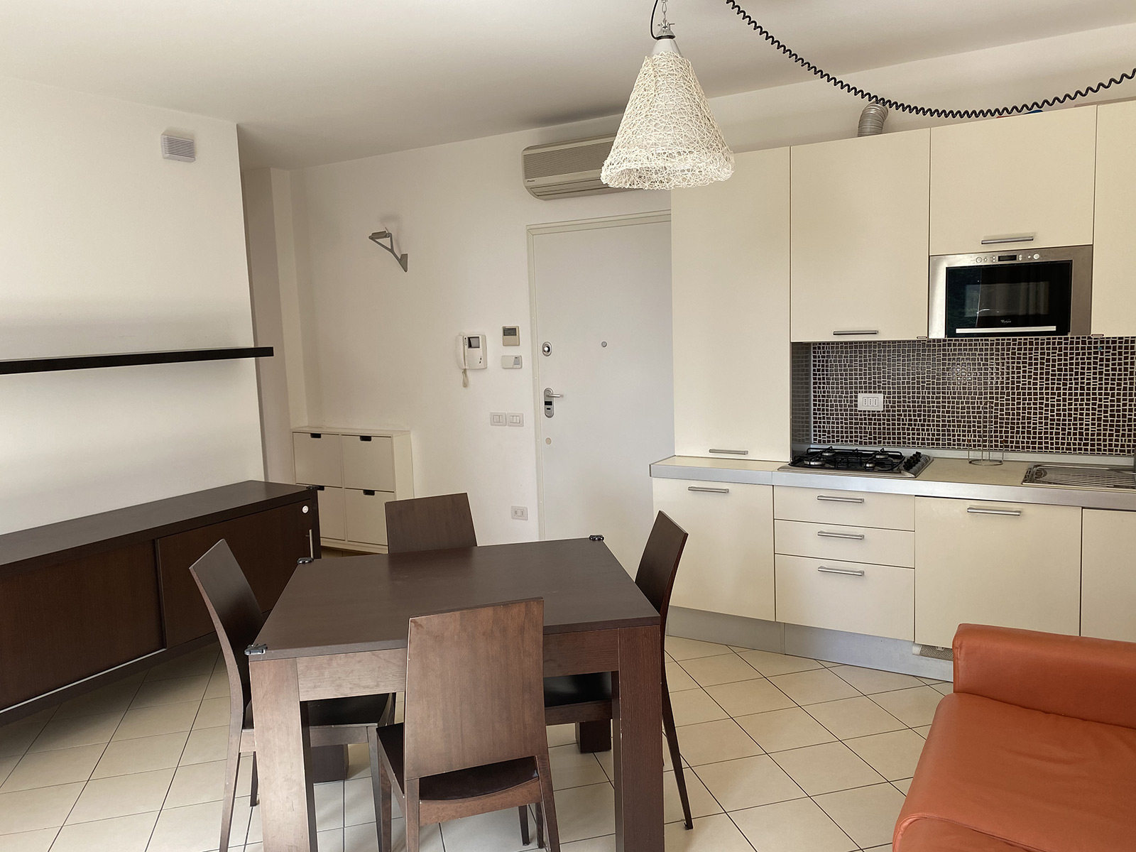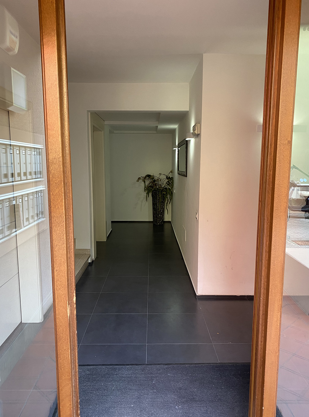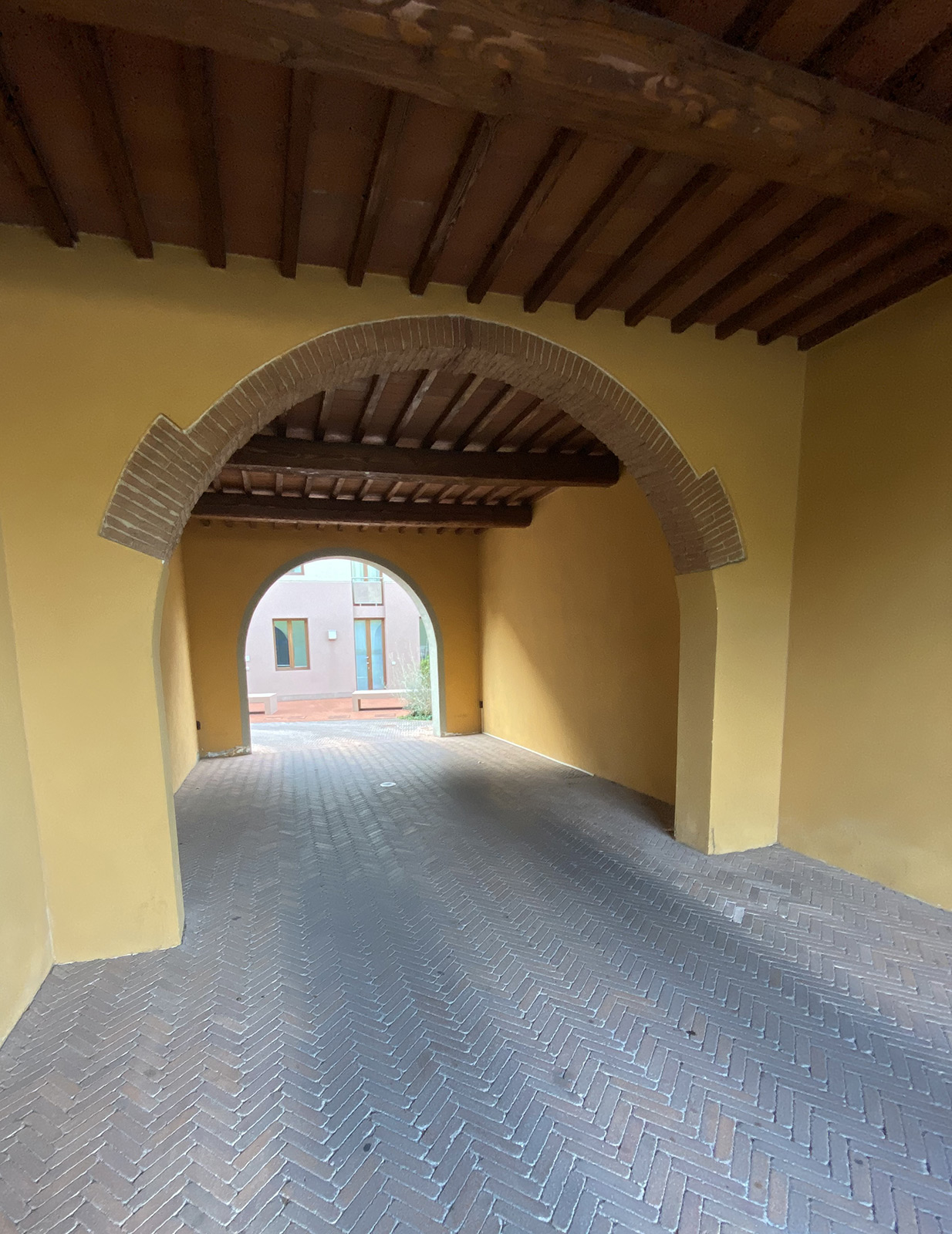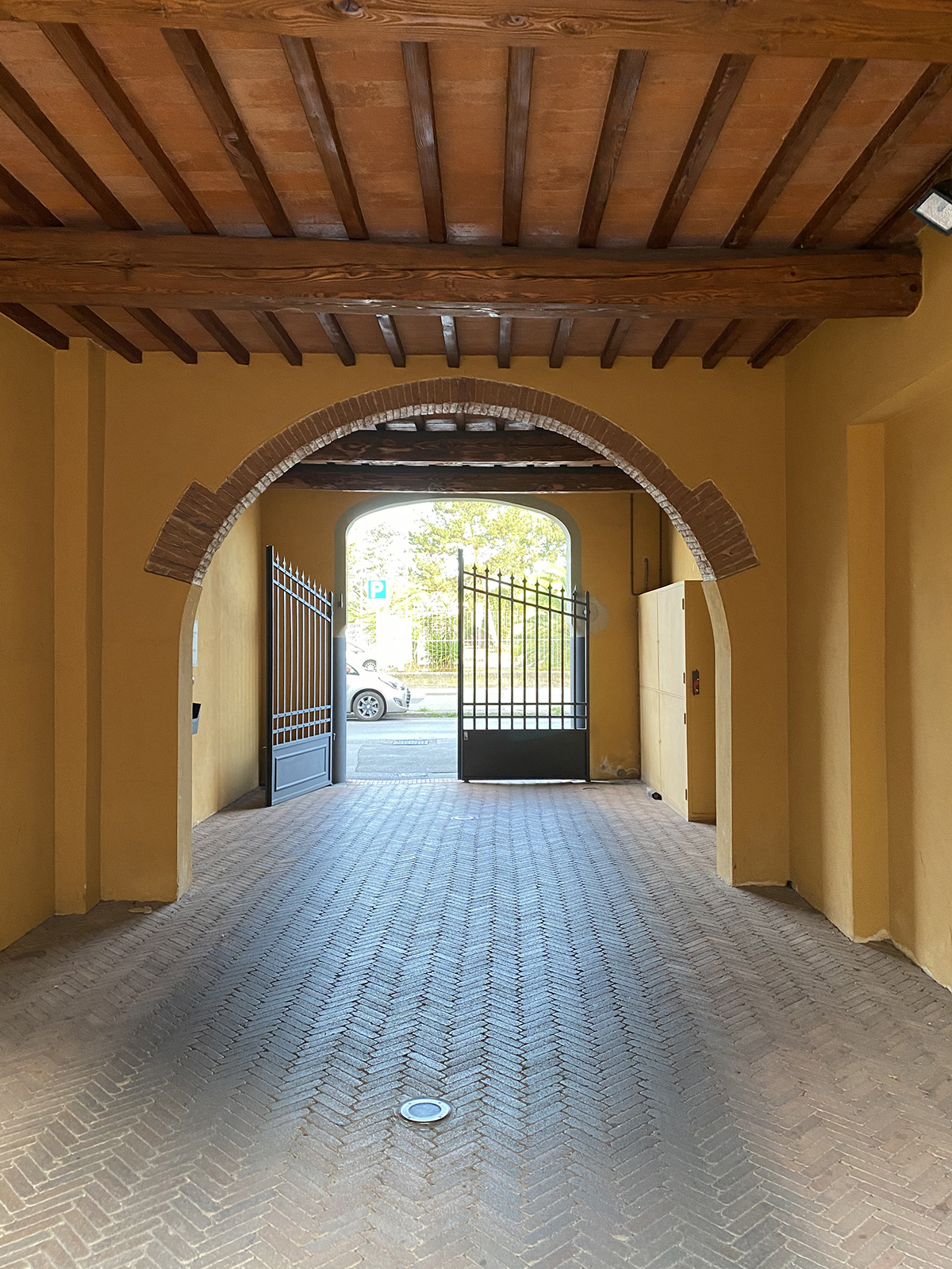The two-room apartment in Empoli centre is part of a three-storey building of innovative design with paved courtyard and benches in front. The building is accessible by residents only through an elegant gate along the main street.