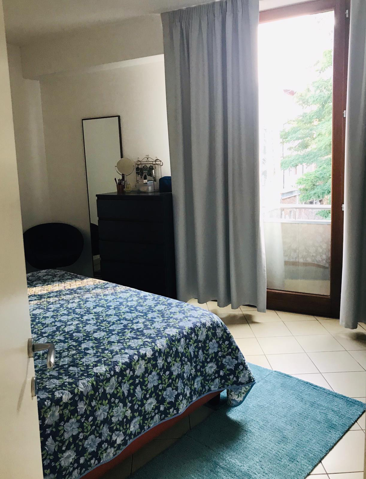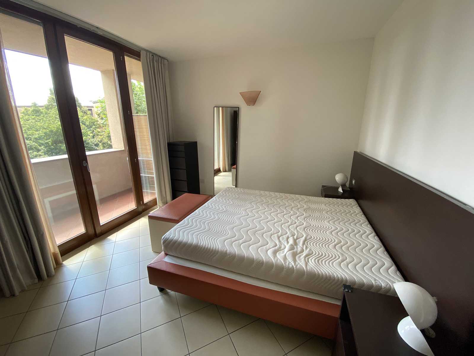 From the living area, one enters the master bedroom through a small corridor. The sleeping area is also finely furnished and illuminated by natural light coming through the French windows. An effect enhanced by the light-coloured tiles of the elegant floor.