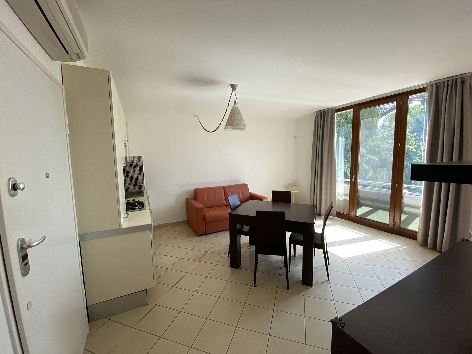 Both rooms lead onto thelarge outdoor terrace, overlooking the greenery. The flat is completed by a bathroom with shower with fine finishes.